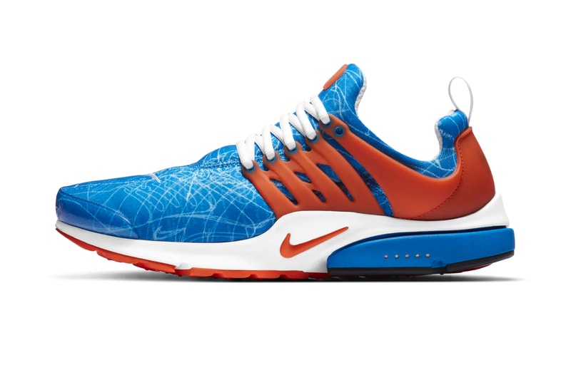 The upcoming release features a bright blue dynamic stretch mesh upper accented by a print of the original sketches for the first Presto. Accenting the upper are molded midfoot overlays and heel counters in contrasting translucent orange. Branding comes in the form of white Swoosh embroidery at the vamp, tongue badges, obscured Swoosh Air markings at the rear and printer insoles. The full-length Phylon midsoles with Air-Sole heel units and Duralon outsoles mirror the color combination expressed on the upper.