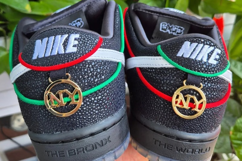 Our first look at the Bronx Girls Skate x Nike SB Dunk Low sees the pair loaded with special details. A stingray-inspired leather texture covers the upper in black as orange, red, and green piping joins white Swooshes for a burst of color. A golden “BXGS” dubrae matches NY-themed hardware hanging at the heel. Just below that, “THE BRONX” and “THE WORLD” text is debossed onto the left and right shoes respectively. Co-branding is also present at the tongue’s two tags, as well as the unique sockliner.