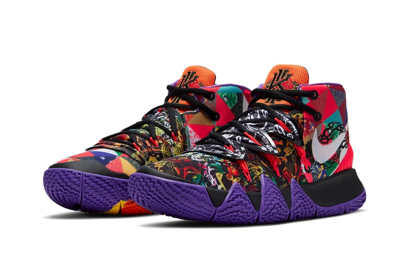 Revealed via Nike by way of official imagery, the mid-cut signature silhouette comes jam packed with intricate details. The hindfoot panels are decorated with multi-colored triangular patterns and arrive embedded with Chinese dragons embroidered beneath its angelic Swooshes. The neighboring areas such as the forefoot, medial panels and venus flytrap-esque throat shroud contrast with more all-over graphics that include floral patterns, mosaics of greyscale Nike logos and more. Tongues and Carved out heel counters that make out the Nets’ point guard’s customary all-seeing eye and healer’s hand insignias are dripped in bold red, the former of which hosts Irving’s logo in black seated next to floral imagery.