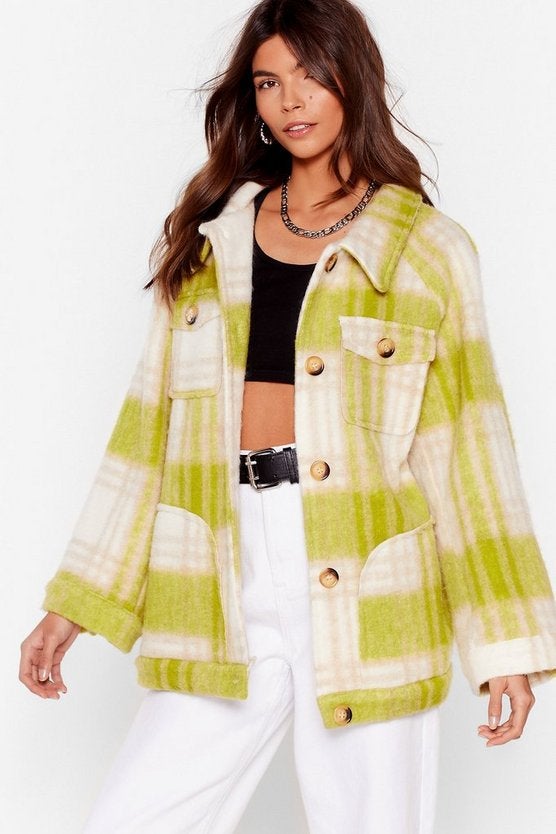 This brushed, lime-green, and white plaid shacket is perfect for brightening up any gloomy spring day.