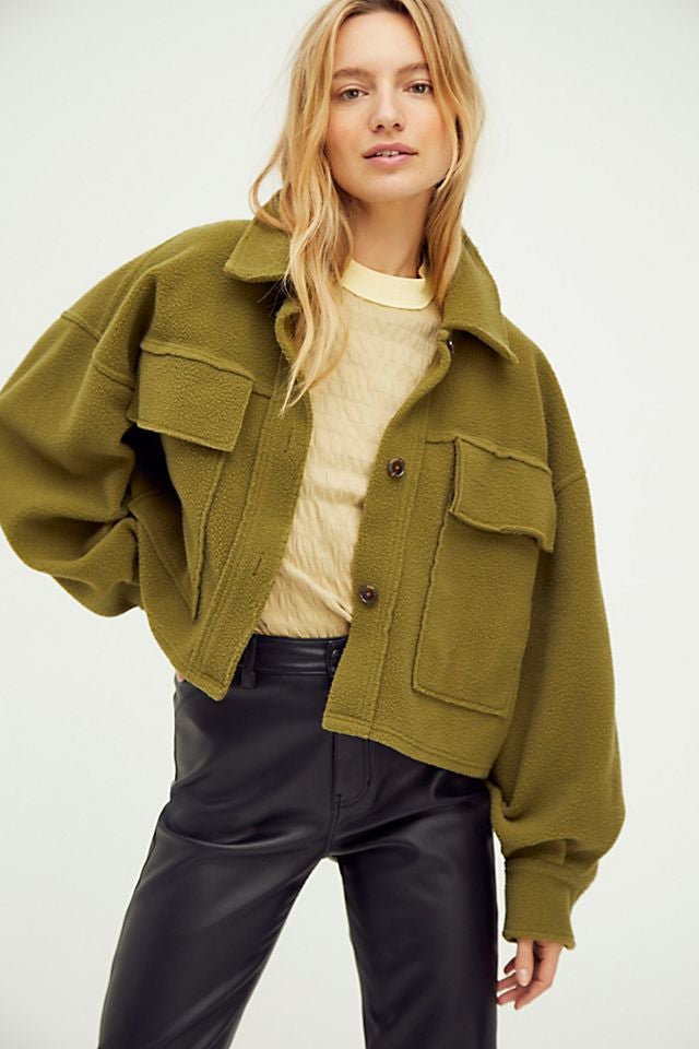 This boxy deep olive shacket will pair well with anything from dad jeans to faux leather.