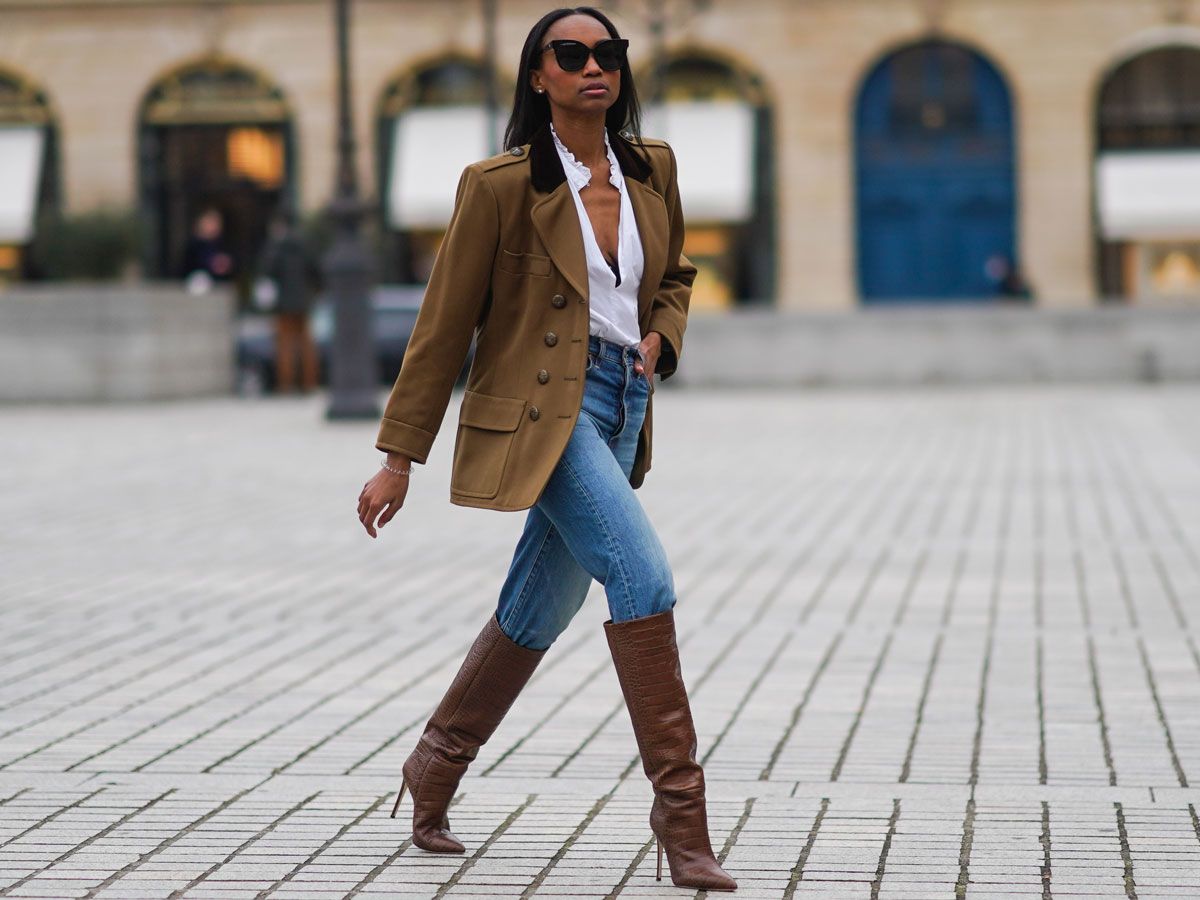 Knee-high boots with mid-height heels are a great compromise if you want a dressier look than flats but don’t want the difficulties of walking in ultra-high heels. I’m obsessed with this Paris Fashion Week street style image below, which shows off the perfect outfit formula for this kind of boot.