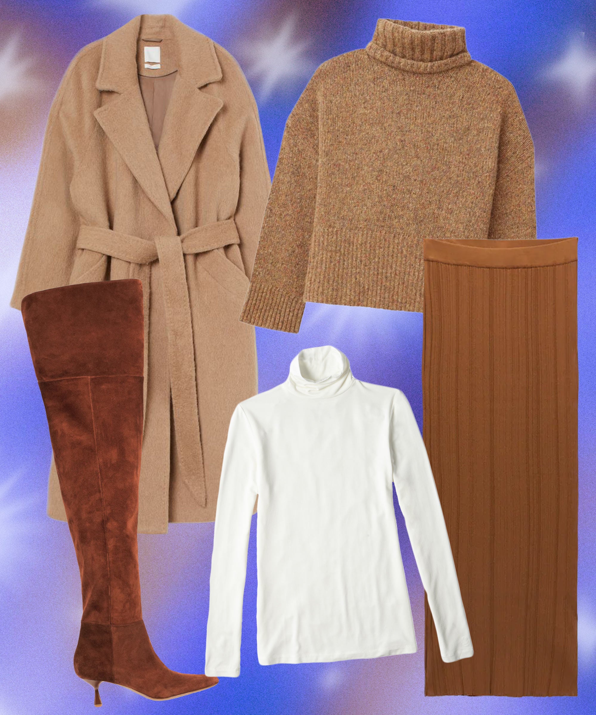 Your outfit: a white turtleneck as your base with warm camel-colored layers on top, made even cozier with delectable textures, like a chunky cashmere sweater and a ribbed knit skirt.