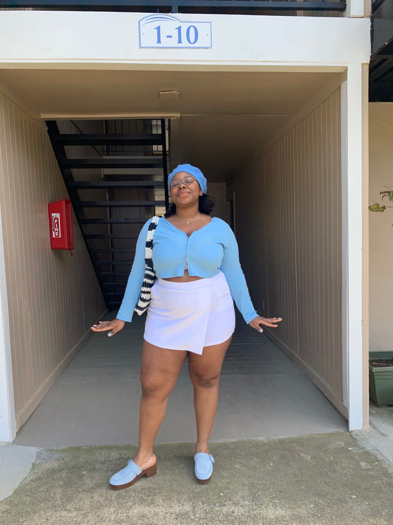 I was honestly inspired to buy the white skirt because I saw a friend wearing it, but I had trouble finding plus-size options! Mine is from Forever 21’s plus line, but Athleta and Target have one that’d work for plus-size bodies too. I chose to pair this outfit with a blue beret, but you could easily use cute butterfly clips or a claw hair clip for just as much of an early-aughts vibe.