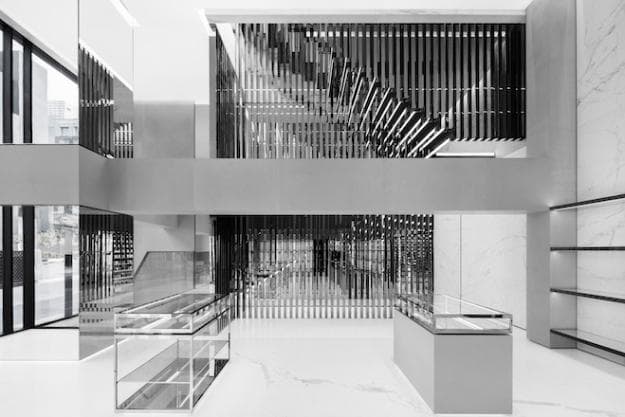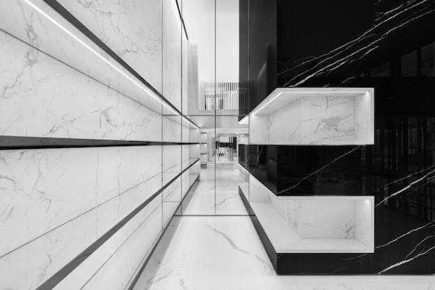 The two-level flagship store, situated along Seoul’s shopping district, is built with black-and-white marble walls and floors. Glossy and matte shelvings are also installed as well as suspended hanging rails. A selection of the brand’s Rive Droite pieces also decorated the space and overall, it is a reflection of the “minimalist and timeless sophistication of the Art Deco style.”
