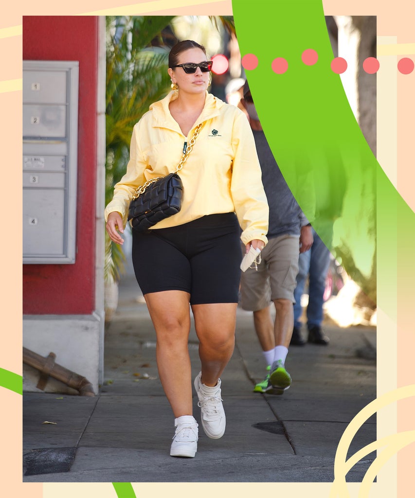 After a year of exercising at home, we’re faced with a dilemma we haven’t dealt with in some time: what to wear post-workout when you don’t have time to pop by the house for a wardrobe change. Luckily, supermodel Ashley Graham just debuted the perfect gym-to-lunch look for us to mimic after our next in-person sweat session. On Wednesday, Graham was spotted in downtown Santa Monica wearing a pastel yellow anorak from the Aimé Leon Dore x New Balance collaboration, Knix bike shorts, and Nike sneakers. Elevating the otherwise sporty look, she added a quilted Bottega Veneta Cassette bag, Alighieri gold hoops, and cat-eye sunglasses.