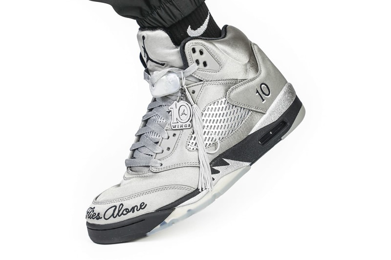 A glistening “Metallic Silver” serves as the base of the sneaker this time around, hosting thematic detailing like a “10” nod at the lateral heel. It also comes with text that reads “In This Family” on the right shoe’s toe and “No One Flies Alone” on the left. The heel’s Jumpman branding features a “WINGS” callout below it while a silver Wings hangtag attached to a tassel completes the celebration.