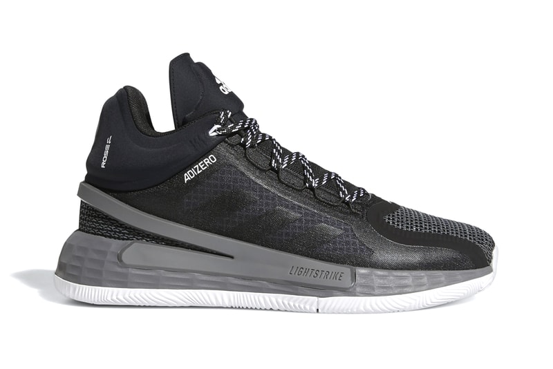 Starting at the top of the shoe are thickly-padded collars that offer substantial ankle support. A large “adidas” logo is stamped in white at the tongue, followed by flecked laces that cover breathable Primeknit uppers. Three Stripes branding appears over adizero-coated sidewalls, while a tonal Rose motif is seen at the heel counter. Finishing off the shoe is a large gray midsole that’s been engineered with LIGHTSTRIKE cushioning technology — a slim TPU shank at the rear supports high-impact movement to enable better mobility.