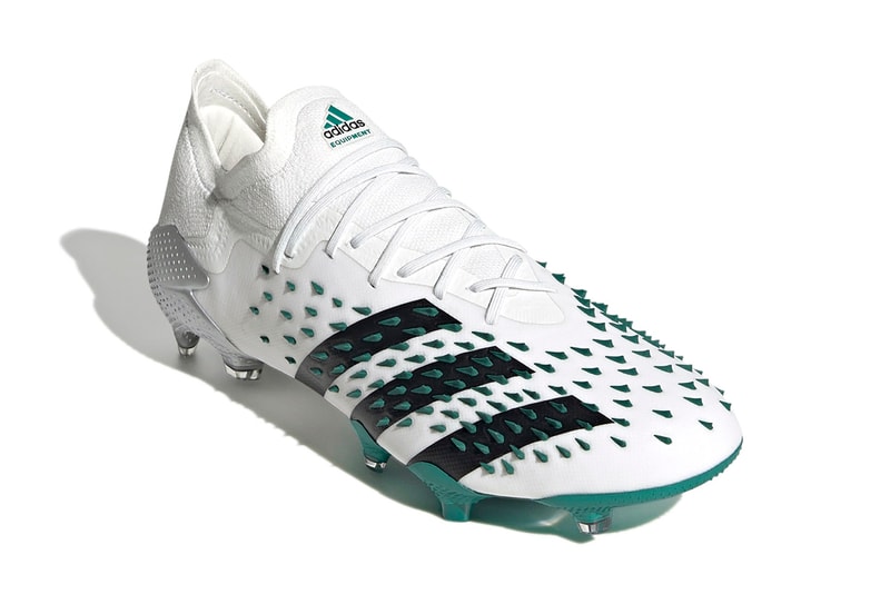 The two boots in the pack are the Predator Freak.1 and the Predator Freak+, both of which feature a white base that covered with adidas’ Demonskin 2.0 spines to give the wearer more control over the ball. Along with the white base, the boots feature black Three Stripe branding and detailing — including the spines — in classic EQT “Sub Green.” This detailing also includes the tongue label and outsole.