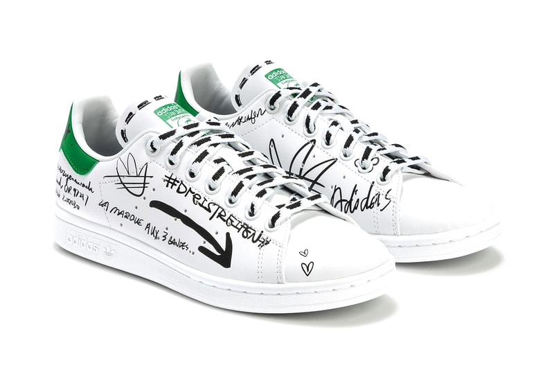 Each side is covered in what looks like marker pen doodles, gracing the “Footwear White” vegan leather uppers with details such as the Trefoil logo, the “La marque aux 3 Bandes” statement, its Herzogenaurach, Portland, and Shanghai HQ addresses, and more.