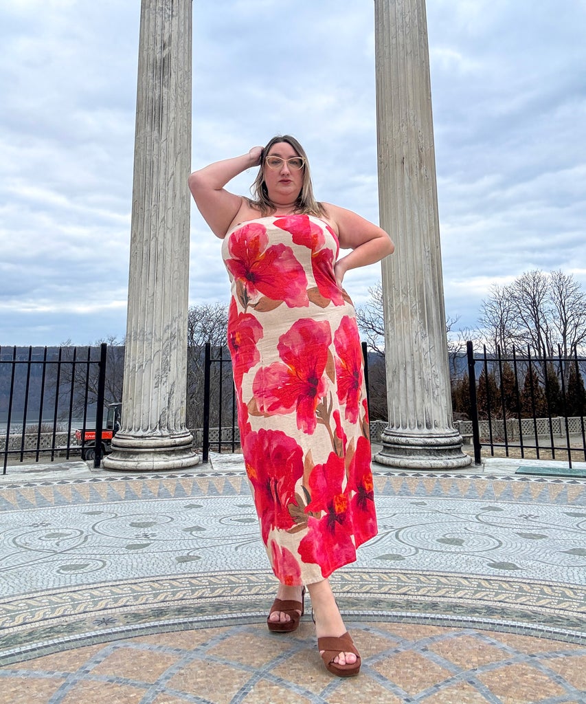 As someone who basically shops for a living (as both an editor and influencer), I know the plus-size market inside and out, and am always on the lookout for the unique pieces we don’t usually get in our size range. This chic linen column gown immediately piqued my interest, because I haven’t seen anything else like it available in true plus range. The exploded, large-scale floral print is striking, and the neutral tones within make it easy to accessorize. I paired it with suede platform heels for a more formal vibe, but it would also look amazing with flat leather sandals and a big straw tote for daytime.