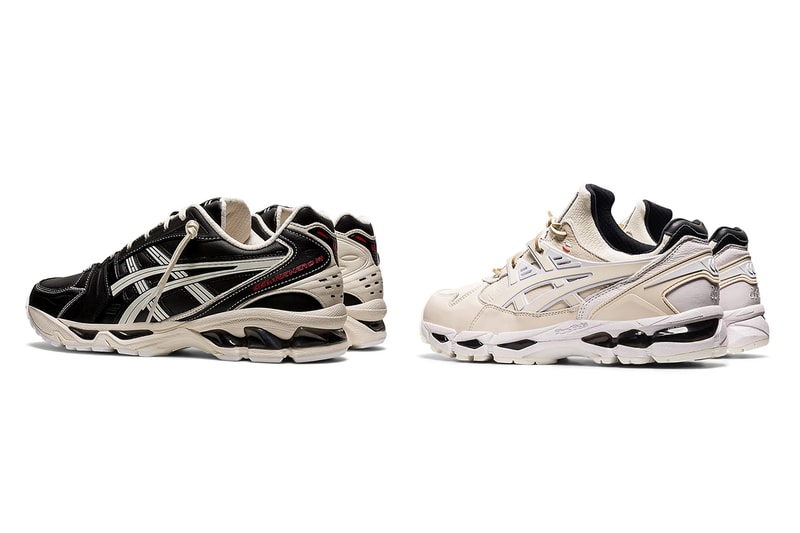 The GEL-Kayano 14 is concocted with a stark black leather build and paired next to bright white accents that douse the exposed stitchings, laces, sock liners and side logos. More complementary hues are visible through the creamy heel overlays as well as the branded hits attached to the tongues and lateral heels which are dripped in dark red. The toned-down thematics proceed down under as the sole unit color-blocks between light beige backgrounds, stealthy GEL foam and white treading.