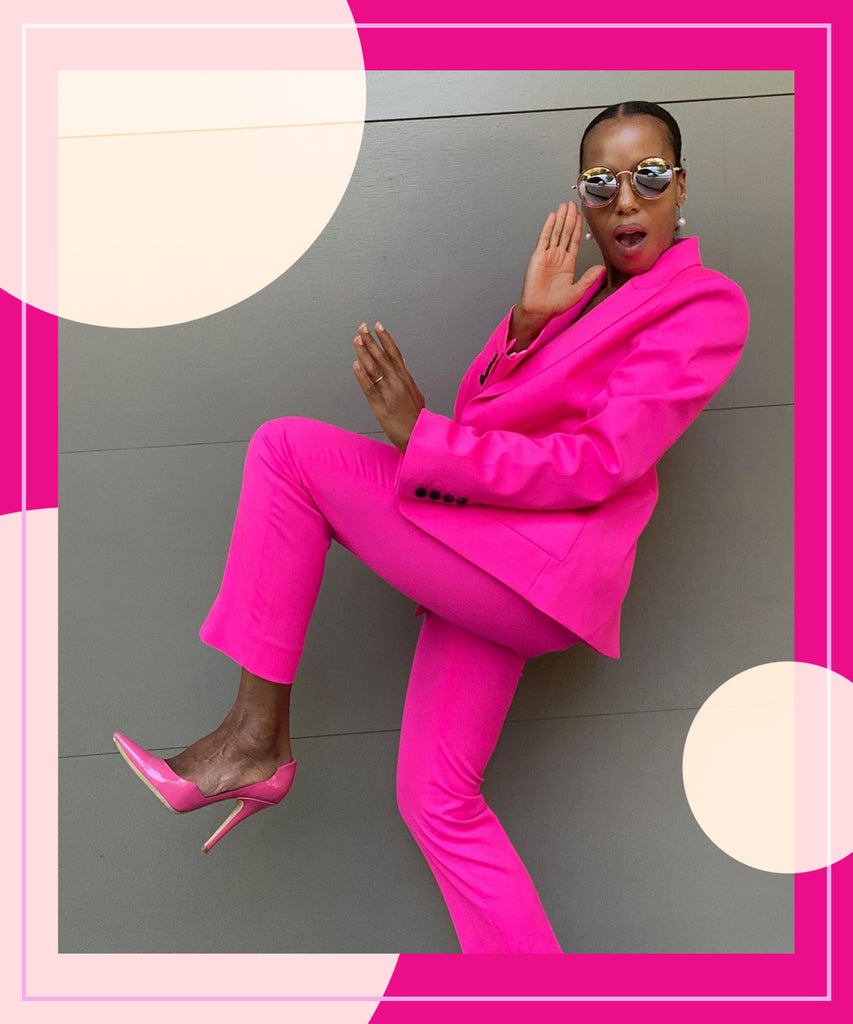 Mandy Moore posed in her backyard wearing the suit in question with black pumps and matching lipstick; Kerry Washington paired hers with mirrored sunglasses, pearl earrings, and equally vibrant pink heels; while America Ferrera got dolled up in Euphoria-inspired eye makeup, which she wore with the suit, white slip-on sneakers, and a T-shirt that read, “Superwoman. Superhero. Superstar. Superpower. Supermajority.” Busy Phillips, Debra Messing, Deepica Mutyala, Amber Tamblyn, Michelle Kwan, and more were also seen donning the bright pink co-ord. Of course, nothing about the surge in suiting was accidental.