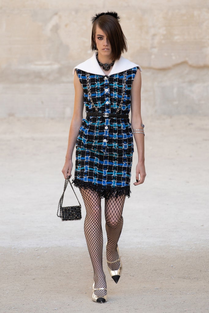 Against the backdrop of a former quarry in Provence, France, models walked to trance music by Sébastien Tellier, Angèle, and more while covered in punk-inspired accoutrements that included fishnet tights (Jill Biden is vindicated!), miniature neckties a la Avril Lavigne, heavy chain belts, and chokers. Though long known for its handbags and shoes, the French house, under the guidance of creative director Virginie Viard, used this collection to move away from its quintessential quilted flap bags and tweed slingbacks. Instead, Viard debuted a more daring and youthful approach to the house’s signatures.
