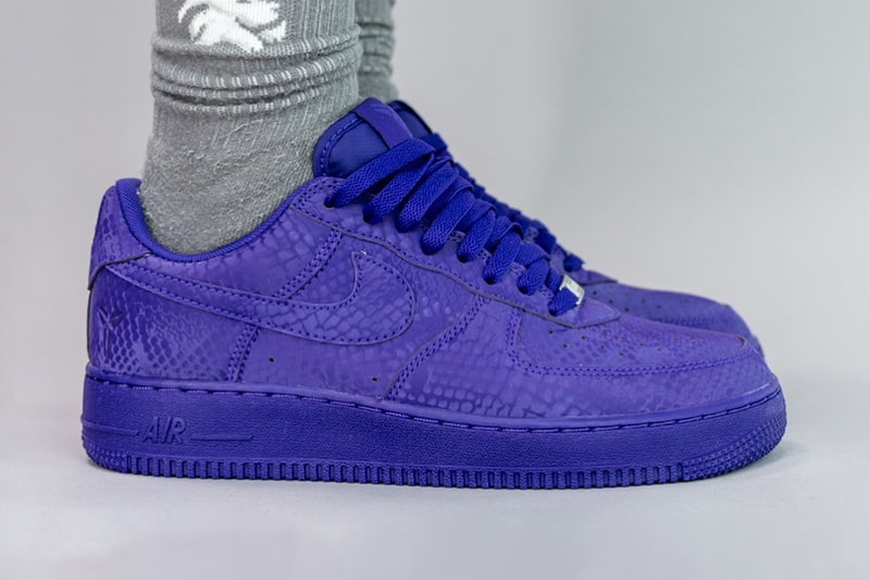 Update: Earlier this week, Nike dropped a Protro version of the Kobe Bryant x Air Force 1 Low in “Soft Yellow.” Another colorway that we previewed is a “Court Purple” one that surfaced at the end of May and now has been highlighted with new on-foot imagery of the kicks. This monochromatic iteration of the shoe sees a snakeskin-inspired upper host “8” and “24” nods at the heel tabs, the Sheath logo at the tongue, and silver dubraes that read “Mamba” and “Forever.” We remain without a release date for the pair, however, it’s anticipated to drop this fall via Nike SNKRS and select retailers at a starting price of $130 USD.
