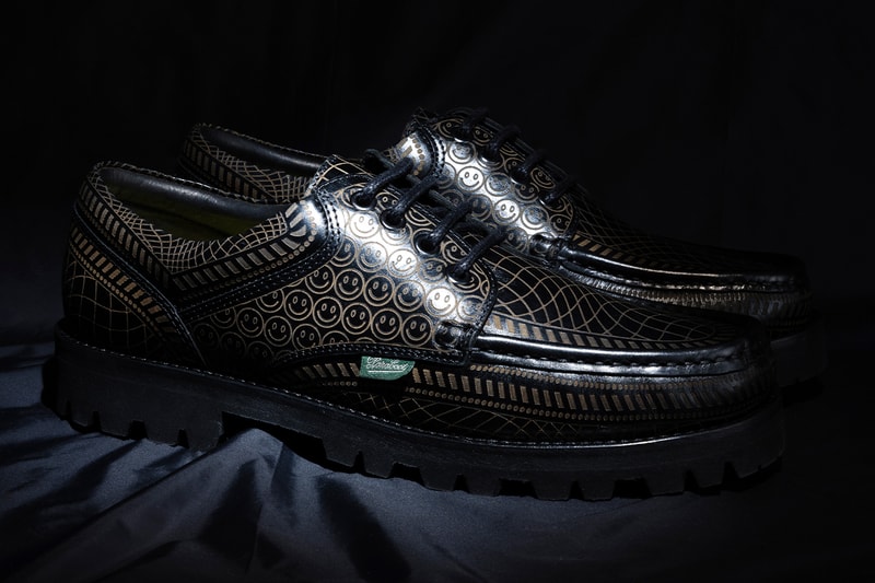 The shoe’s foundation is built on impeccable European quality, featuring a robust Blake stitching technique and a meticulously hand-stitched moc-toe construction, all engineered in Paraboot’s renowned workshops. This heritage base provides the canvas for Dime’s whimsical touch: the black leather upper is entirely embossed with warped geometric textures interspersed with playful smiley patterns, instantly transforming the conservative silhouette.