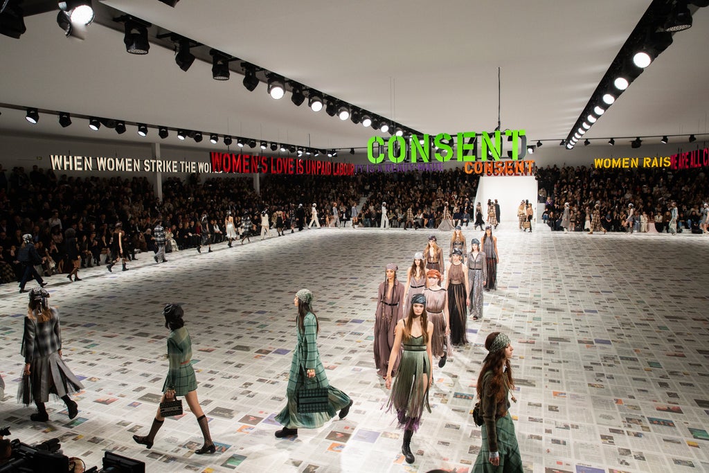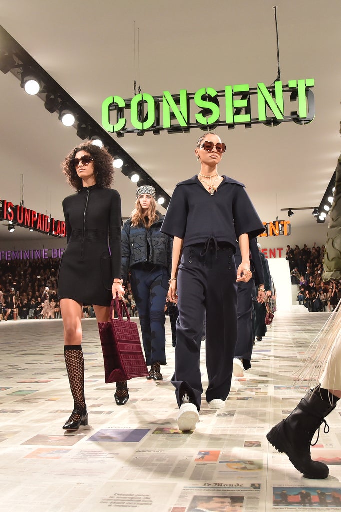 It remains to be seen whether the connection between Dior’s styling and feminist messaging will become more than just slogans. Can a luxury brand ever be truly feminist? I’m not sure. By definition, luxury is inaccessible, a fact that makes it inherently at odds with feminism’s core value of equality for all people, full stop. And then there’s the fact that despite the clear climate change reference, there was no information about the brand’s plan to become more sustainable. If the show’s point was to call out patriarchy, its choice to exclusively cast young, thin, normatively beautiful models was a tacit endorsement of the patriarchy’s oppressive ideas of what ideal women should be. Promoting consent is better than not doing so, but what would be even better is if the women modeling the clothes — who, we have to assume, are supposed to embody the messages that hung above them — were of different ages and body types. Surely plus-sized women and older women deserve consent and clitoral orgasms, too.