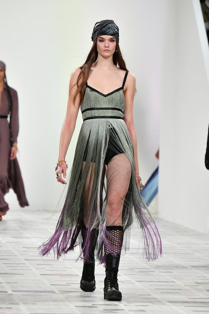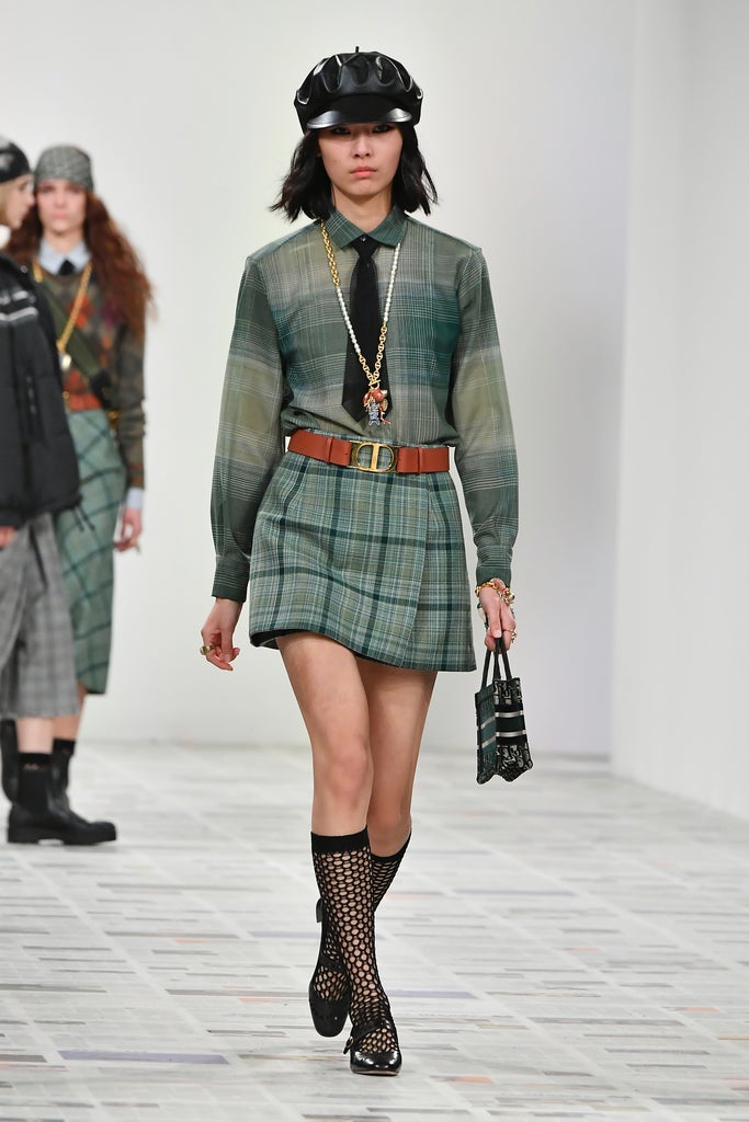Pop feminism — derisively called T-shirt feminism by critics — has become core to Dior’s brand under the creative direction of Churi, whose controversial $710 “We Are All Feminists” tees became a symbol of this consumer trend. And these signs, created by artist Claire Fontaine (and clearly inspired by artist Jenny Holzer’s text-based installations) were emblematic of this post-2016 identity. Meanwhile, the clothes themselves were a continuation of menswear references and school-boy cues like shrunken ties and tweed jackets, with repeating motifs like checks and, of course, fringe (find me a fall 2020 runway without fringe — I’ll wait). It was all very wearable, and certainly commercially viable, but I didn’t see anything that was as radical or insistent as the flashing words above it.
