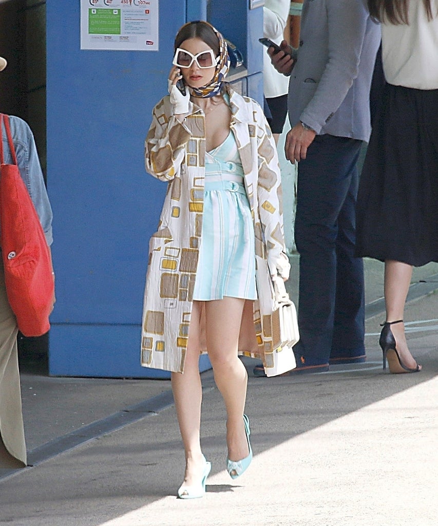 Having left her Audrey Hepburn-inspired Christian Siriano dress (top photo) at home in Paris, Emily’s summer persona looks to be much more relaxed, with photos from the set showing the protagonist wearing high-waisted bikinis, oversized sunglasses, and silk scarves tied around her head. A pool scene sees Emily in a teal-blue bikini with a patterned robe and kitten heel sandals. While visiting the town’s city center, she wears a retro-esque scarf-sunglasses look with a baby blue mini dress, a Mod trench coat, and a box-shaped purse.