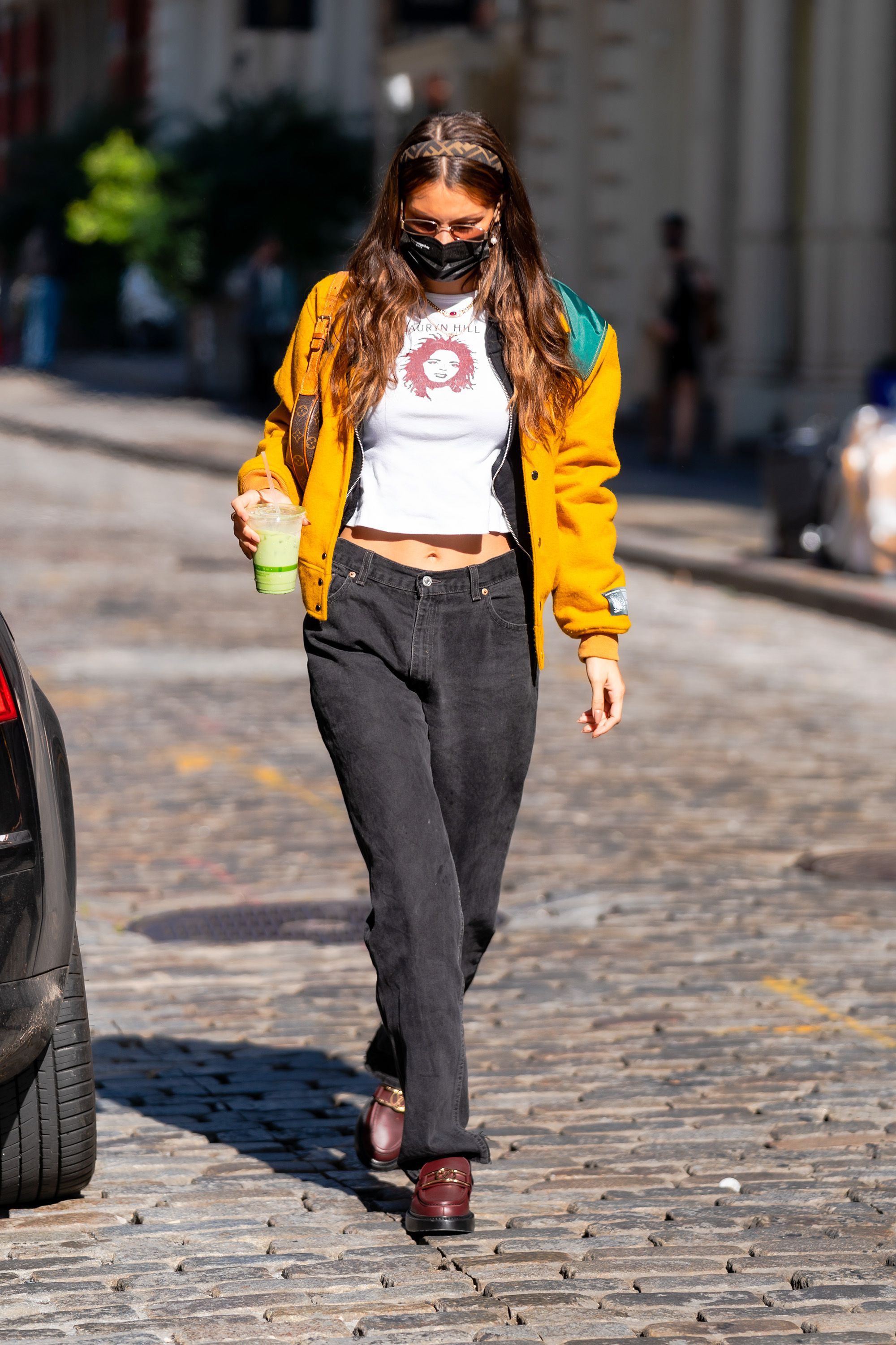 A sure-fire way to make baggy jeans look cool is to go the ’90s route, pairing a slouchy pair with a cropped graphic tee and a retro varsity jacket (this one is by Reese Cooper) à la Bella. Photo: Gotham/GC Images.