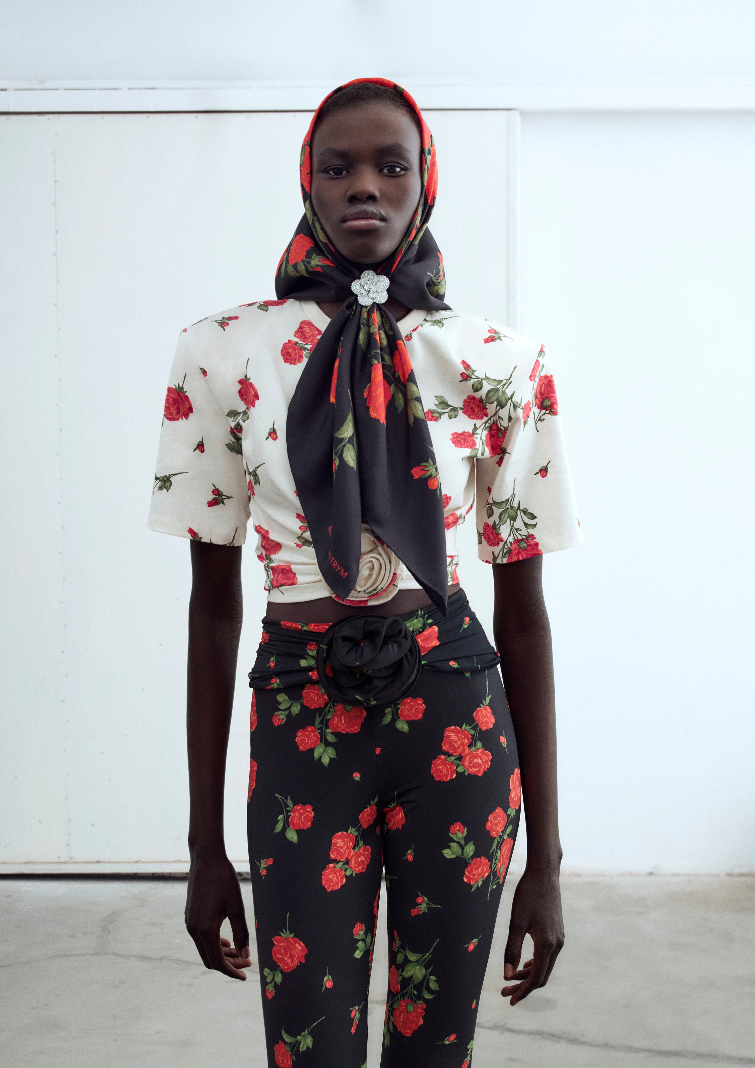 Roses are at the heart of this collection, as Butrym sees them as a “symbol of womanhood: both soft and confident, delicate and independent, arresting and ever-growing.” How poetic. It’s also intended to be a “celebration of femininity in bloom,” which couldn’t be any more apparent through the blooming catsuits, headscarves, and mini dresses (which model Vittoria Cerreti gave us a taste of), as well as the rosette-covered bodysuits, gowns, and heels.