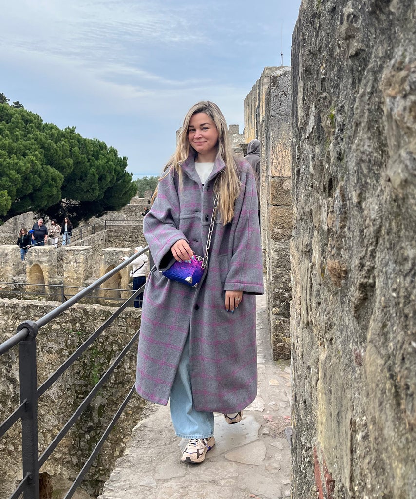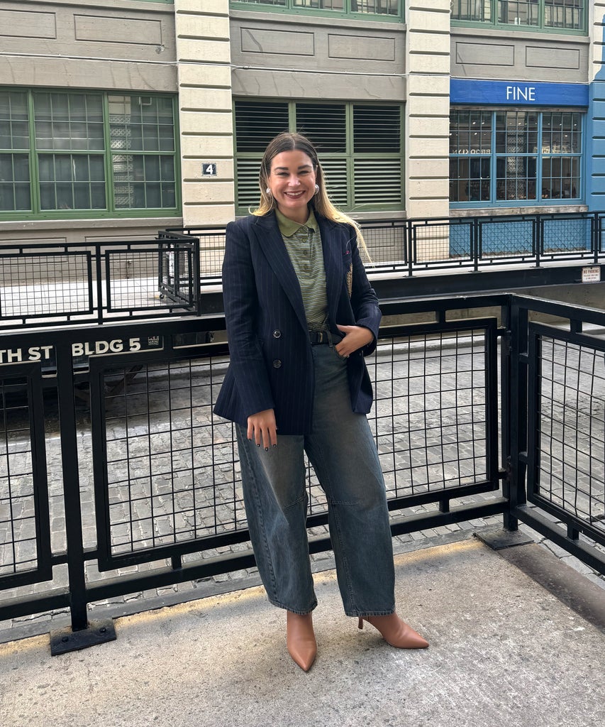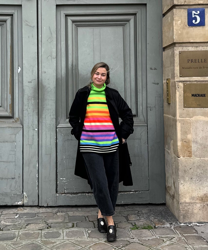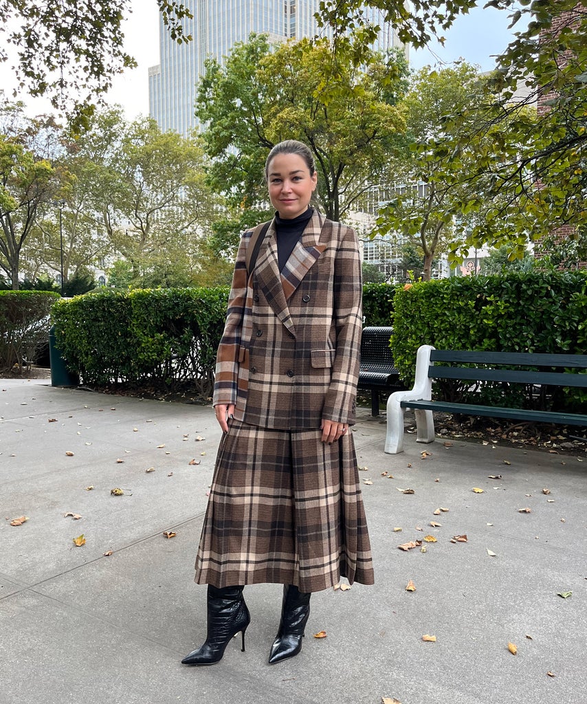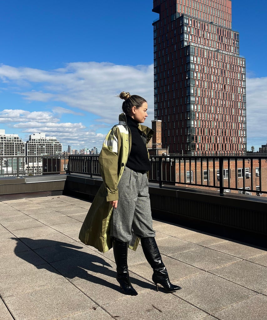 In a sea of black, gray, olive, and brown coats, I prefer black, gray, olive, and brown coats — with a twist. For the last few years, I’ve been switching between a utilitarian jacket from the collaboration between Scandi darling Ganni and Icelandic outerwear experts 66°North (pictured two photos us), a gray peacoat with a pink windowpane print from Essentiel Antwerp (pictured here), a brown denim trench coat with a gold design that I got secondhand from Dries Van Noten, and a flannel-like jacket from Isabel Marant. I live in New York City where my coats get at least five months of use (and eyeballs); as such, I wear them as statement pieces and, instead, stick to a neutral palette underneath. This is also a category area that I splurge on, investing in pieces that will last me a long time. To the point that I still have — and wear! — the first nice jacket I bought with my first big-girl-job paycheck at AllSaints in 2011.