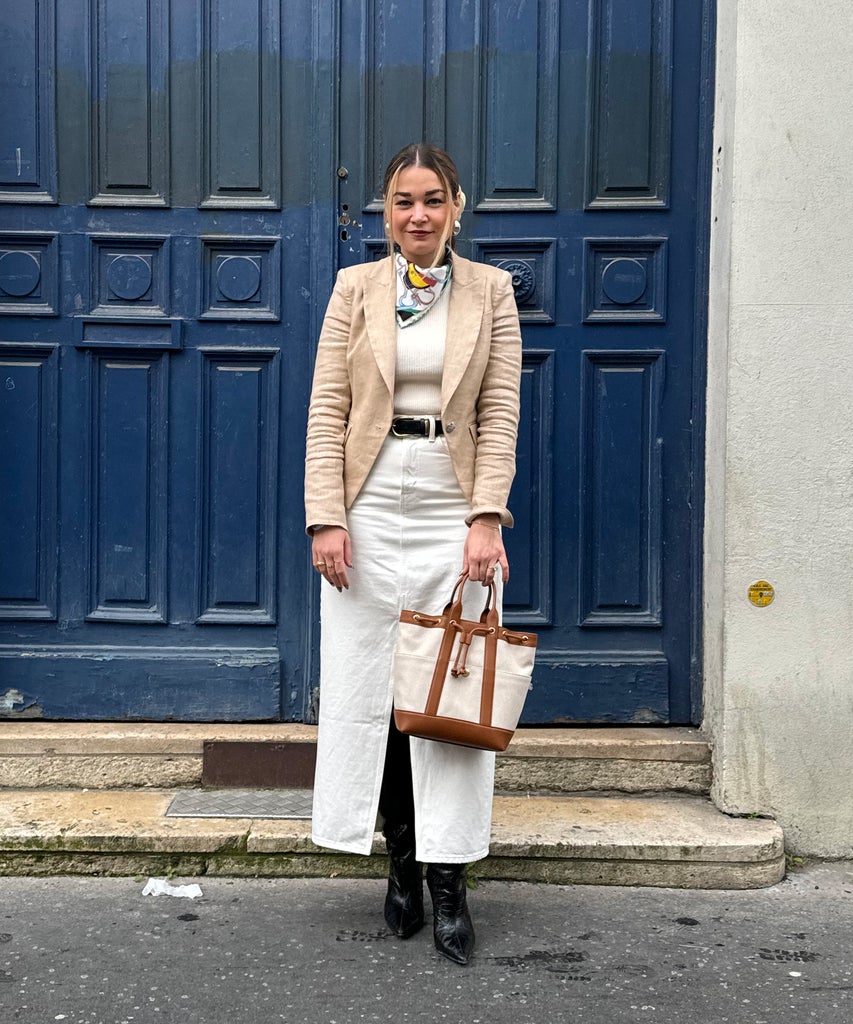 When it comes to my bottoms, I rotate between a winter uniform of midi silky skirts that I pair with oversized sweaters, baby tees, and structured vests; maxi denim skirts that go with blazers and collared shirts; dark-wash denim that doesn’t look out of place in work settings; and go-with-everything pants (see: these almost sold-out A.L.C snap track pants) that look just as good with sneakers as they do heels. While I don’t subscribe to one denim brand, I am partial to jeans from Mother, Levi’s, Still Here, and, most recently, Jamie Haller, who managed to convince me to wear cargo pants again! Saint Art is responsible for my favorite skirt of the last year (with Agence’s maxi version a close second).