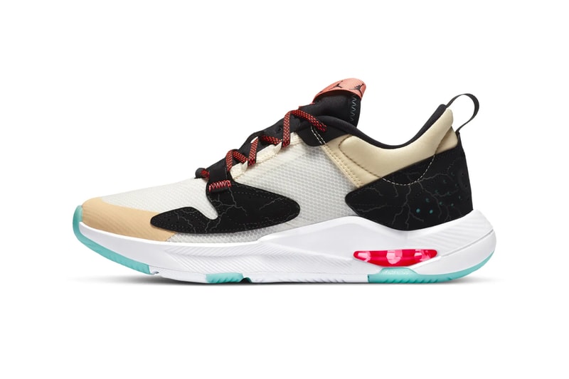 Starting at the top of the shoe is a sleek ripstop pull tab stamped with Jordan Brand’s “Jumpman” logo, set over a cushioned nylon tongue. The sidewalls are lined with breathable mesh fabrics, complemented by “Pale Ivory” tones along the heel and toecap. Contrasting black panels at the rear quarter and lateral forefoot round off the uppers’ vibrant color scheme, while an articulated midsole engineered with Nike’s Air sole unit at the heel finishes off the bold silhouette.
