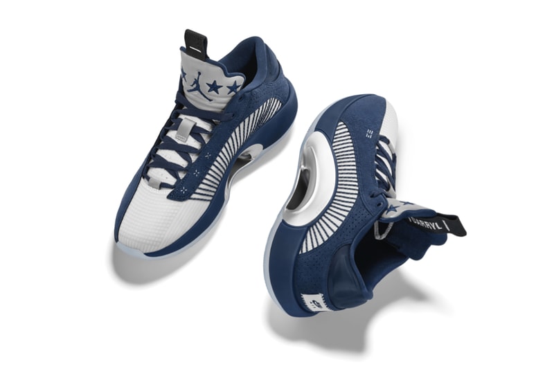 The overarching theme of this hardwood-ready iteration is predicated on Daryl Levert — his father — and his love for America’s team in the Dallas Cowboys. The NFL squad’s team colors are translated onto the upper, dark navy being pronounced on the nubuck overlays, cables and Cowboys-inspired stars on the tongues, while a metallic silver outfits the underlays, toe boxes, heel Nike Air stamps, throats and the midsole Eclipse plates. To further pay homage to his dad, a “Darryl” spell out is embroidered in the interior side of the tongues. Stacked underneath all of that are midsoles that come dressed with more navy and outsoles that are presented with a milky finish.