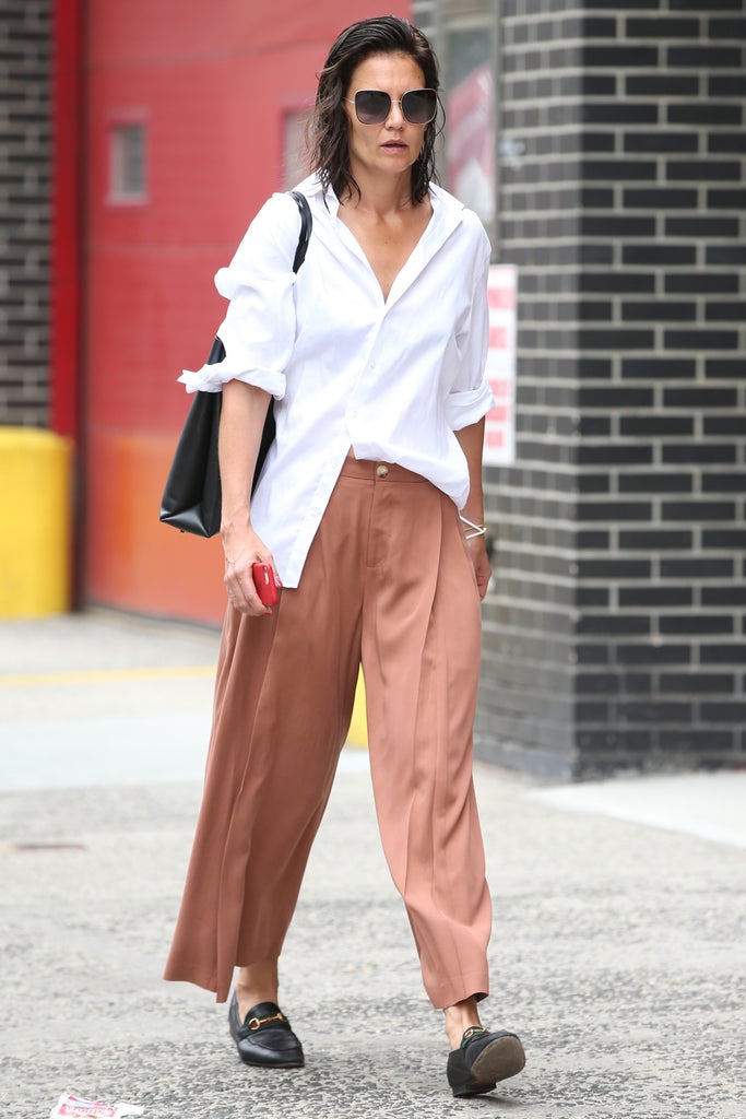 If you’ve been combing through street-style round-ups in search of an end-of-summer uniform to help your transition into fall, look no further than Katie Holmes’s latest getup. On Tuesday, the Dawson’s Creek alum was spotted in New York City, wearing baggy rust-colored trousers, her signature Gucci loafers, and a men’s button-down shirt — our go-to for breezy, yet put-together workwear during lockdown.