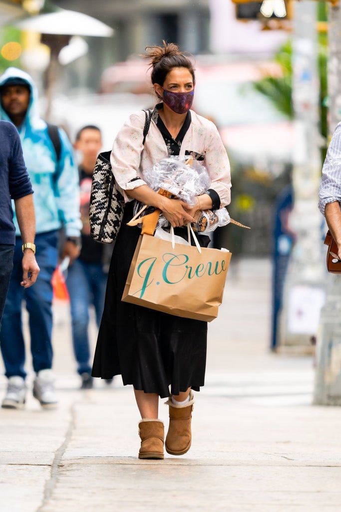 Further solidifying her role on our spring style mood board, Holmes was seen wearing another favorite shoe style on Monday: UGG boots. Off-set, the actress appeared in a pair of the SoCal brand’s Mini Bailey Button II boots in chestnut, which she paired with a black, midi-length skirt and a flowy, floral blouse.