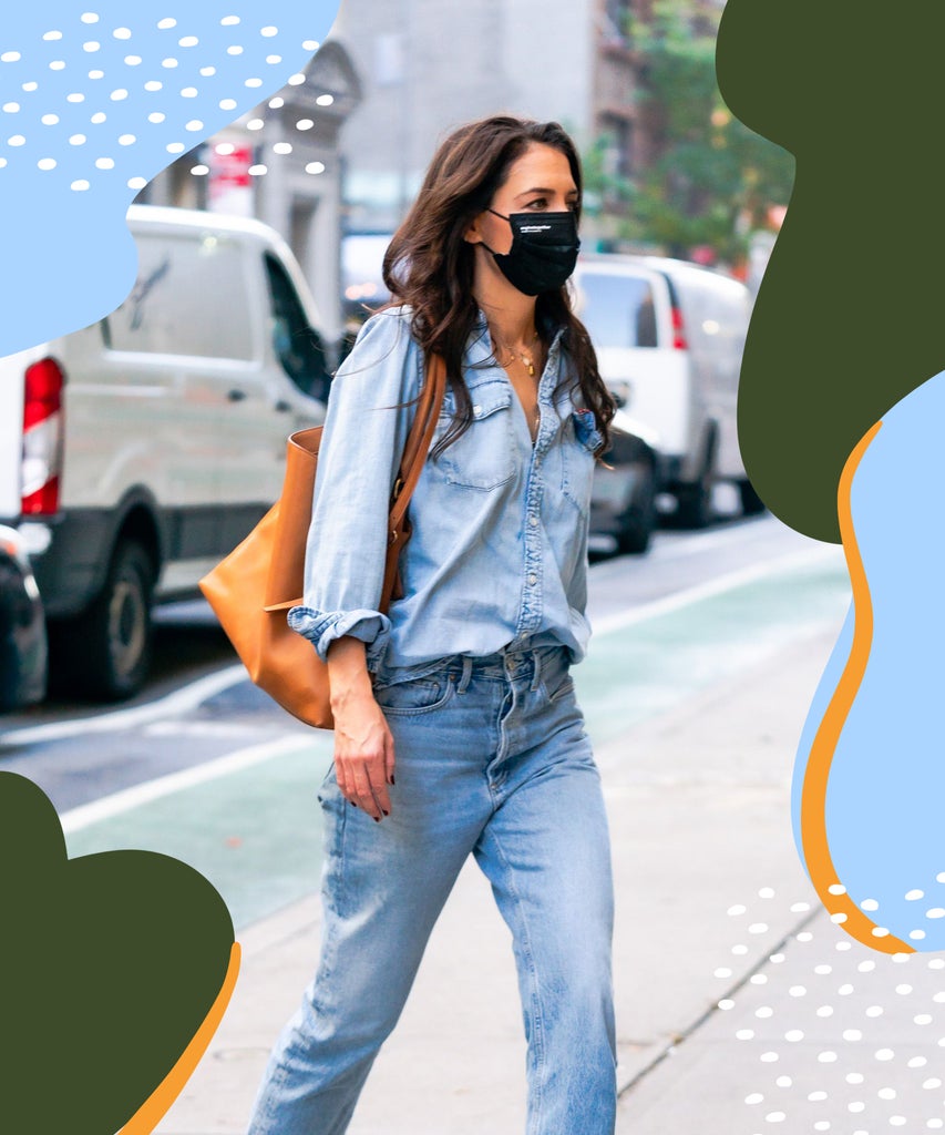On Monday, Katie Holmes stepped out on an uncharacteristically warm New York City day wearing head-to-toe denim: a faded button-down shirt with a pair of equally faded jeans. Not only did she nail the double-denim look, but she paired it with spring-summer’s most popular shoe: Bottega Veneta braided Lido sandals in yellow. (Tracee Ellis Ross recently paired the same heels in white with an aqua blue sweatsuit.) To top off the look, she wore a cognac-colored tote bag and her signature evolvetogether face mask, a favorite amongst celebrities, including Hailey Bieber and Kaia Gerber.