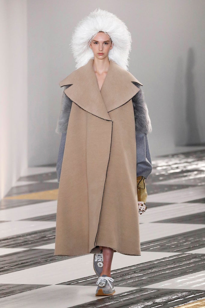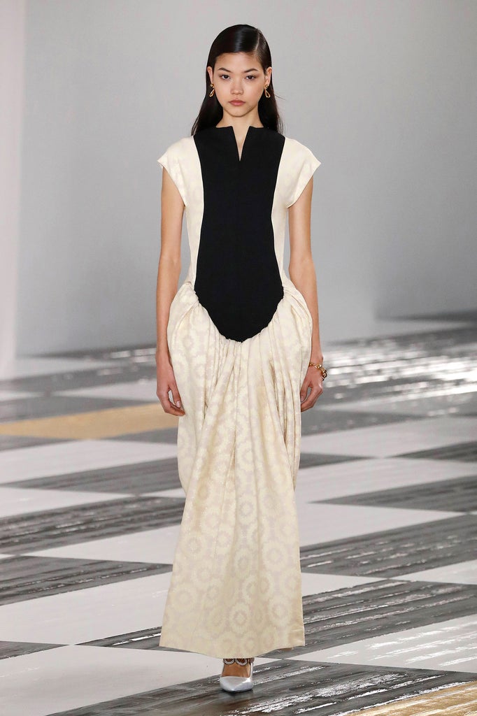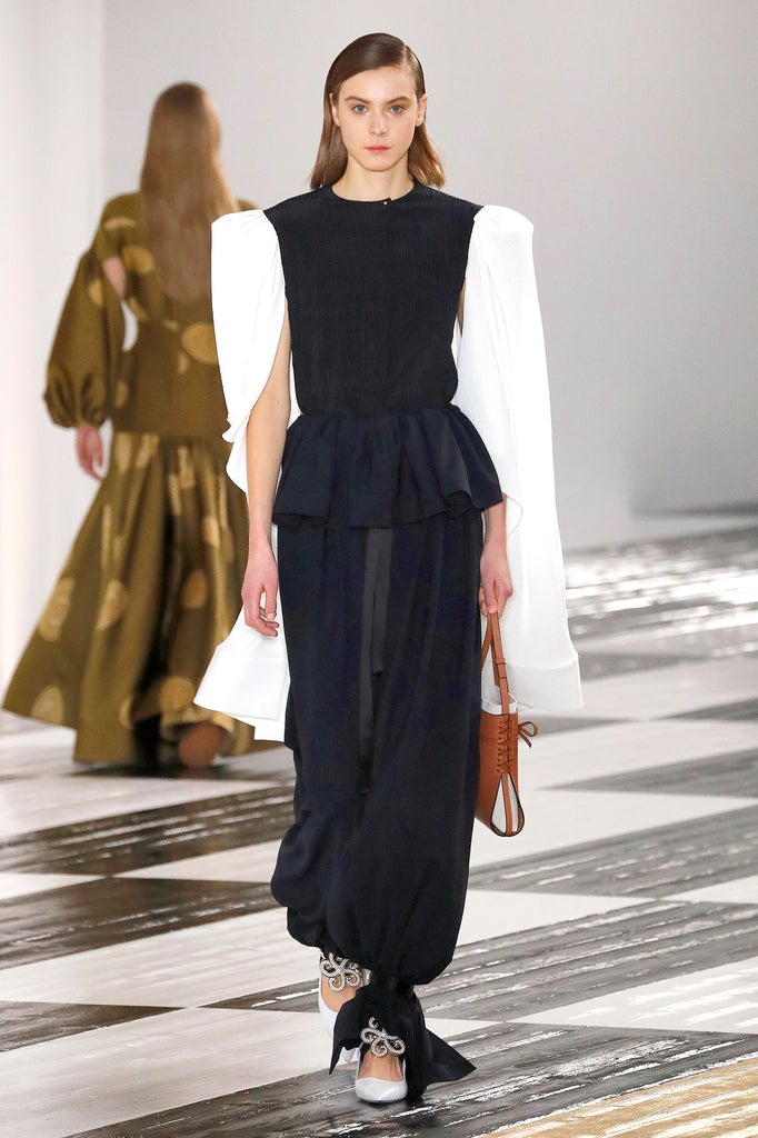 Balloon jumpsuits, draped frocks, gargantuan coats, and Loewe’s signature corset-waist fits also appeared in this morning’s show, as did double-balloon gowns à la Balenciaga in the ‘50s, stiff sleeves and collars, and a hefty dose of feathers.