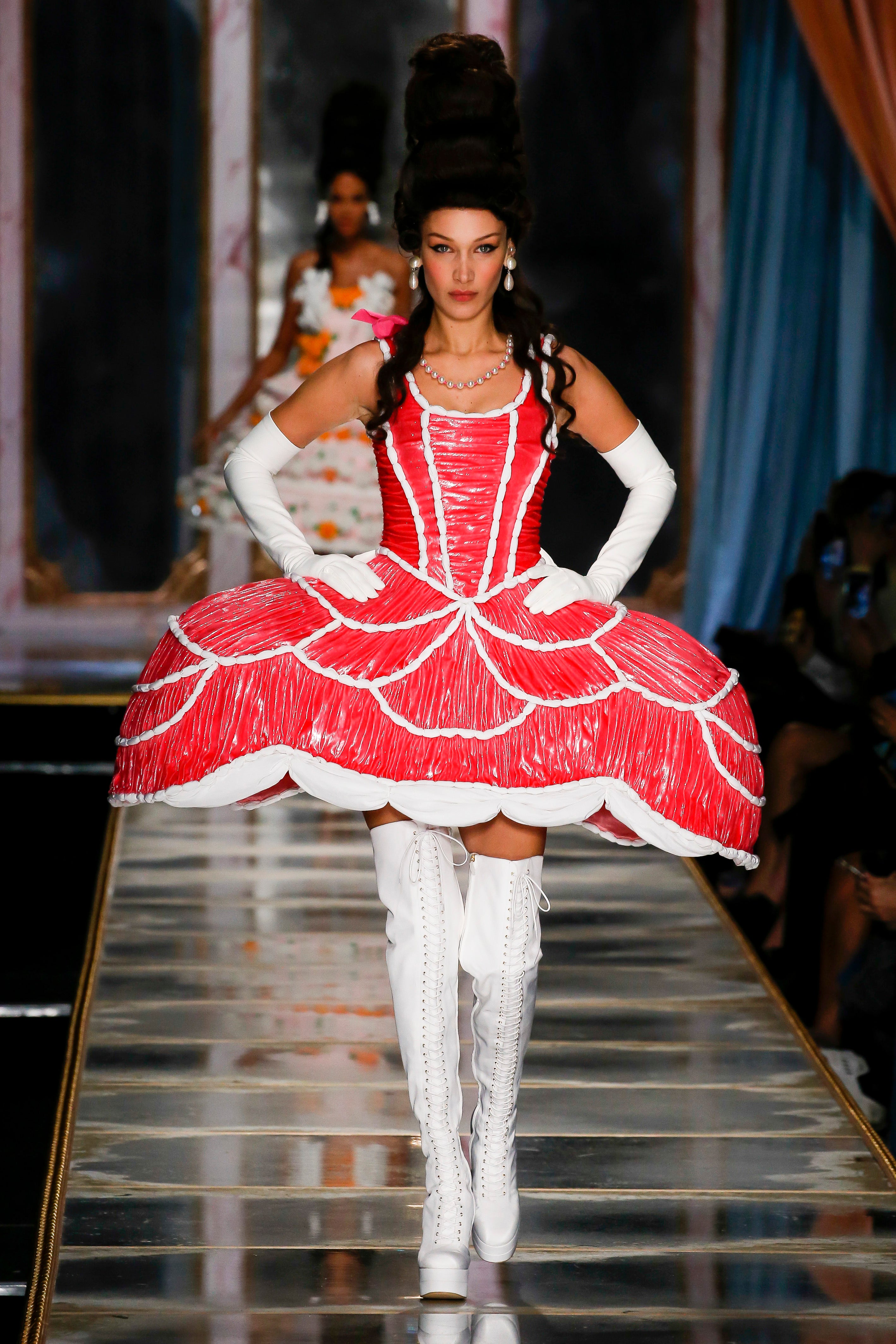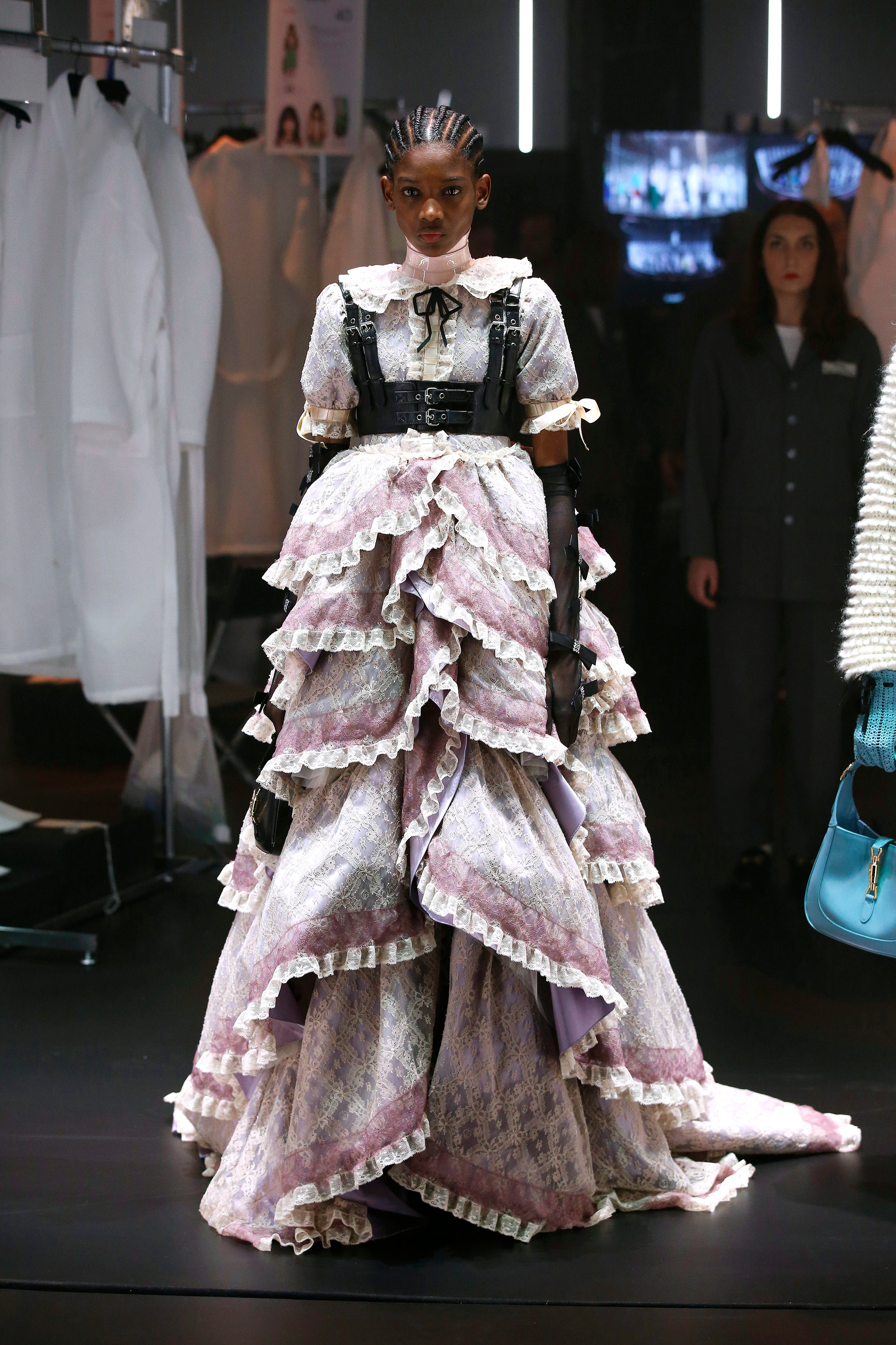 Corseted dresses with layers of voluminous, lacy ruffles dominated the runways, in a Western-saloon-meets-Renaissance vein. At Gucci, gowns were large, romantic, and classic. At Fendi, they were figure-hugging, the lace draped and belted for a more modern feel. And at Moschino, gowns were finished with enormous bustles, an ironic throwback made to feel contemporary with extremely short hemlines.