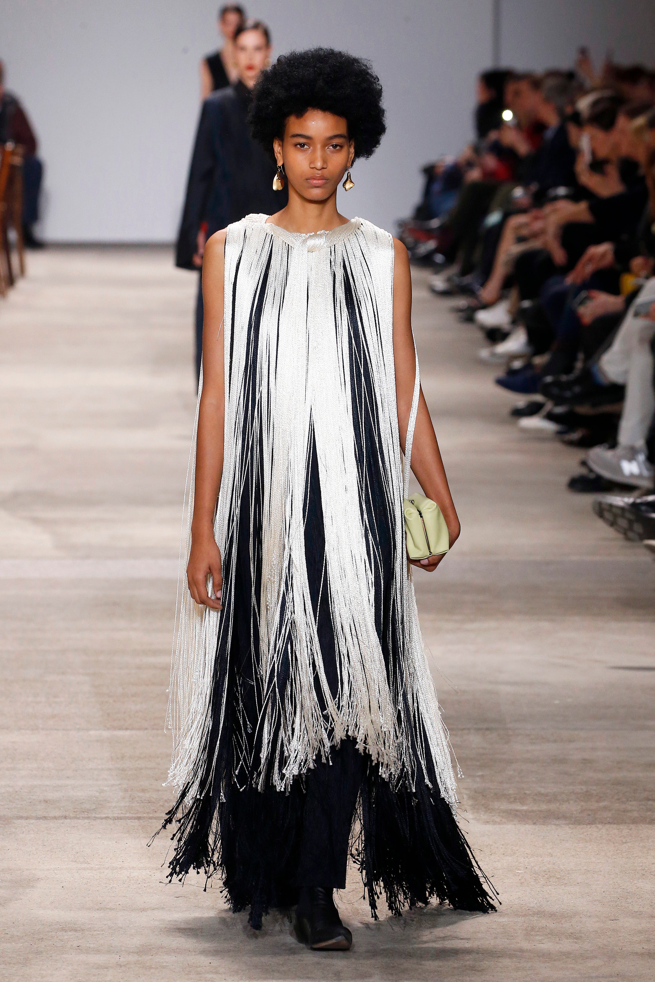 As models moved down countless runways, fringe swirled around them, hypnotically bouncing and swaying. At Prada, suiting was sharply tailored and then decorated with swaying fringe of various thickness, over and under blazers, trousers, and skirts. Fringe played heavily at Bottega Veneta, too, decorating the edges of sweaters, bags, dresses, and coats, in colors that included a very pleasing kiwi green. More fringe was seen at Philosophy Di Lorenzo Serafini, Salvatore Ferragamo, Alberta Ferreti, and Fendi, until it became so ubiquitous that I began to think ahead to fall 2020: Will we be able to wear anything without fringe?