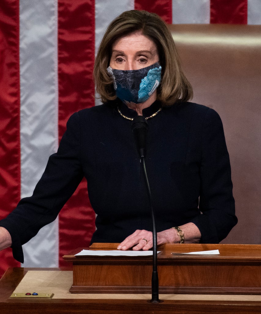 For this impeachment proceeding, Pelosi replaced her pin with another statement-making accessory: a blue, floral face mask. While wearing a face mask in public should be a given at this point in the pandemic, this follows the news that a third member of Congress had tested positive for COVID-19 following the Capitol riots after being evacuated into a room where some Republicans refused to wear a mask. The patterned mask holds even more meaning now that Pelosi has imposed a $500 fine for House members who refuse to wear a mask, according to Forbes.