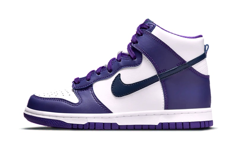 While further information about the Nike Dunk High in navy and “Court Purple” to release in adult sizes, the shoe is slated to release in grade school sizes by the end of the year at select retailers and via SNKRS.