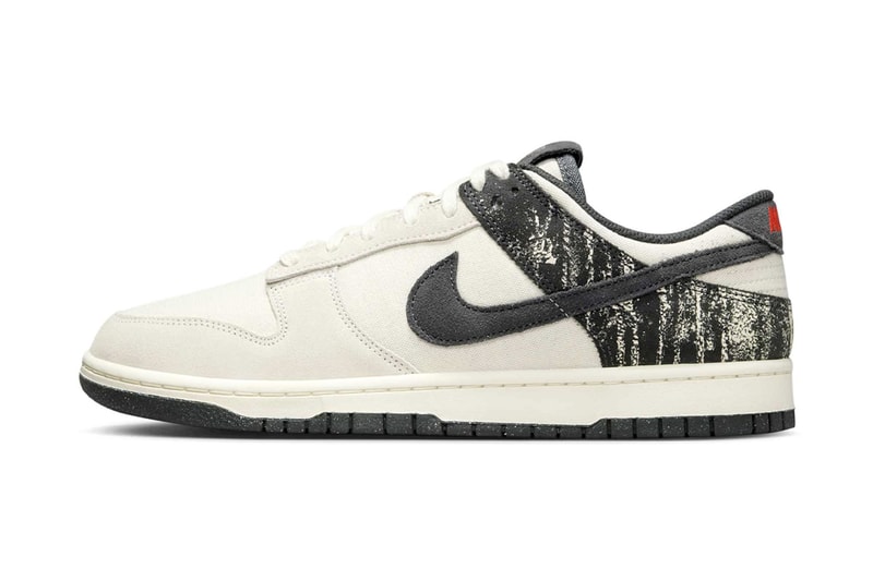 Nike has dropped a new Dunk Low, this time giving it a punk aesthetic. The shoe’s “Pale Ivory/Dark Smoke Grey” colorway stands out with its classic mix, featuring distressed off-noir panels. The shoe is constructed out of canvas and suede materials for the upper, giving it a lightweight and durable feel. The shoe’s nike branding is hit with a picante red for emphasis and contrast while the shoe sits atop a dark, speckled outsole crafted out of recycled materials from Nike’s Next Nature series. The shoe is now available online.