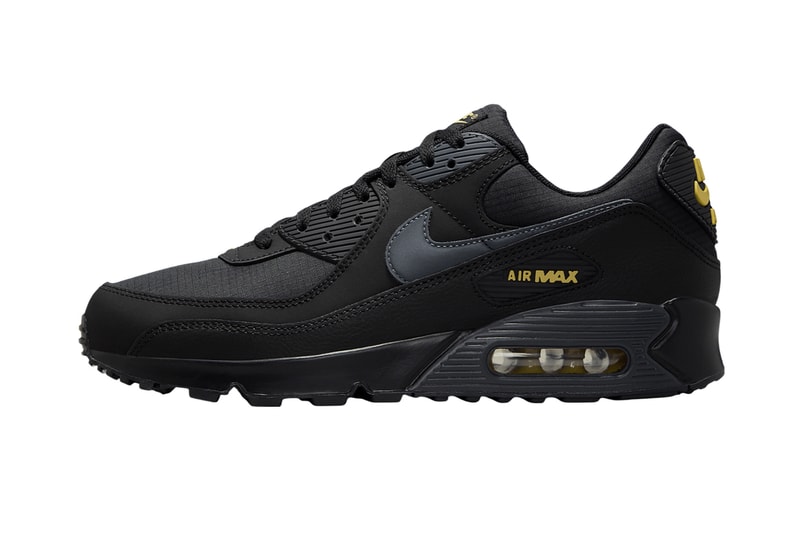 Notes: Nike is summoning the Batman with this inspired Air Max 90 “Black/Buff Gold.” Set for a Spring 2025 release, the upcoming model is crafted with synthetic fibers, mesh and leather in a sleek all-Black hue, while contrasting pops of gold land on branding details such as the Air Max ankle insignia, tongue tag, insoles, Nike Air heel logo and embroidered mini swoosh by the laces. Soft hits of gray can also be spotted on panel swoosh, eyelets overlays, midsole and heel. A visible Air Max unit — the defining feature of the Air Max line — is fitted by the midsole, while matching Black laces tie them together for a polished finish.