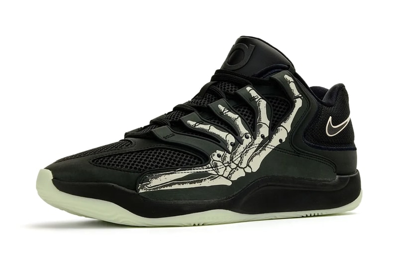 The “Halloween” KD 18 taps directly into Kevin Durant’s “Slim Reaper” persona, drawing inspiration from Nike’s popular “Skeleton” Air Force 1 series. The shoe features a predominantly black mesh and synthetic base, providing a dark canvas for its most striking detail: a pale, bone-like skeletal hand graphic that wraps dramatically from the forefoot to the heel across the upper. This eerie visual mimics X-ray designs seen in previous holiday drops, transforming the sneaker into a wearable piece of anatomical art. Adding to the spooky vibes, the design incorporates a glow-in-the-dark outsole, ensuring that its haunting aesthetic stands out in low light. The Nike Swoosh is subtly outlined in white on the collar, while KD’s logo blends seamlessly into the all-black tongue, maintaining a sleek yet thematic look. The aesthetic also reportedly draws inspiration from the rugged design of the Nike Terra Humara trail runner, blending Nike nostalgia with Durant’s contemporary taste.