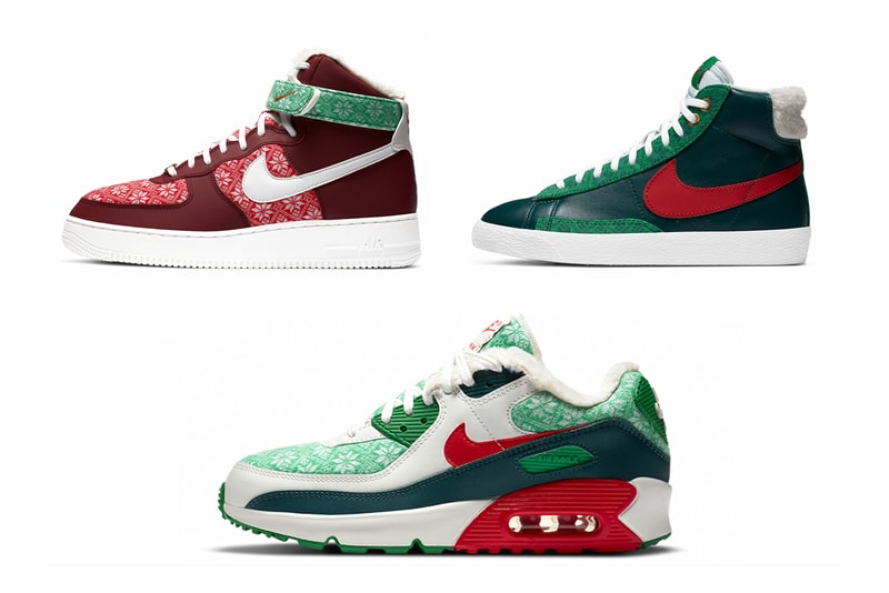 All three shoes are dressed in a mixture of green, red and white, but apply their hues in different fashions. The Blazer uses a pine green leather base with light green suede on the eyestays, mudguard and toe cap, all of which also feature a snowflake print. On the other hand, the high-top Air Force 1 is mostly dressed in red, using a rich burgundy shade on the collar, heel, eyestays and mudguard while equipping red and white sweater-style snowflake prints on the toebox and quarter plus the same pattern in green on the proprioceptus belt. White Swooshes and midsoles round off the look. Lastly, the Air Max 90 strikes the most balanced look of the bunch with white and pine green leather overlays, green/white snowflake print on the toebox, tongue and collar and red on swooshes, tongue tags and midsoles alike.