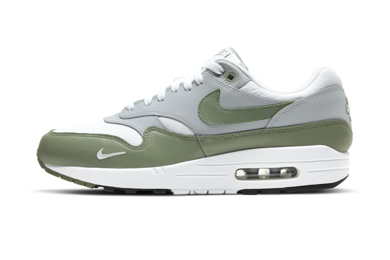 Woven at the top of the shoe is a “NIKE” tongue tag, placed over a set of crisp white laces. The uppers are fully covered in full-grain leather, and white panels that appear along the collars and toebox are complemented by gray at the heel and sidewalls. “Spiral Sage”-toned panels show up at the sides and mudguards, while an embroidered mini-Swoosh at the forefoot and “NIKE” branding at the heel round off the sneaker’s details. All of these features rest over an immaculate white midsole equipped with a transparent Air sole unit for added comfort and support.