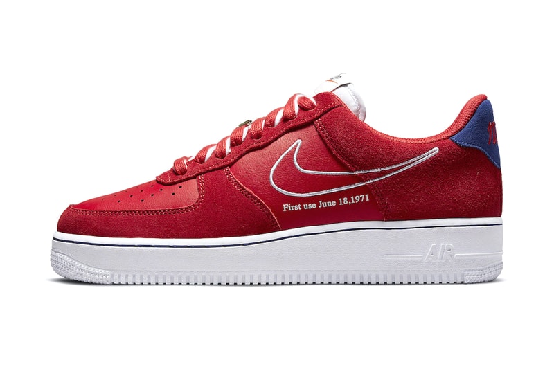 Most of the shoe is covered in a bright “University Red” tone, complemented by pops of white and “Deep Royal Blue.” There’s a retro-inspired “Nike” tag at the top of the shoe, followed by duo-laces and gold mini-Swoosh deubrés. At the heel is a blue suede panel, while a thin outline of a Swoosh at the sidewalls, a short phrase nodding to the silhouette’s original debut — “First use June 18, 1971” — and a crisp white midsole round of the shoe’s bold design.
