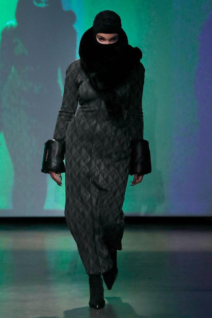 Marine Serre’s fall ‘20 show allowed viewers to hold both feelings — fear of death and love of life — at once. The audience sat on benches so low, we were nearly on the floor; the space was dark and mirrored, other-worldly from the get-go. Imagining a future in which humans are spread out on inter-connected planets, the collection was grouped around the different cultures on our new hypothetical homes, and the individual environmental and metaphysical challenges they face. An all-white skirt and top, complete with silvery tights and a white face-scarf to protect from moonlight; a double-breasted, floor-length coat fit for battle. Puffer jackets with hoods that, structurally, extended from the torso like an insect thorax, to protect from extreme cold. A black dress with puffer sleeves and a ball-skirt made for time travel. Serre’s visual narrative was so convincing that these scenarios seemed completely within the realm of possibility.