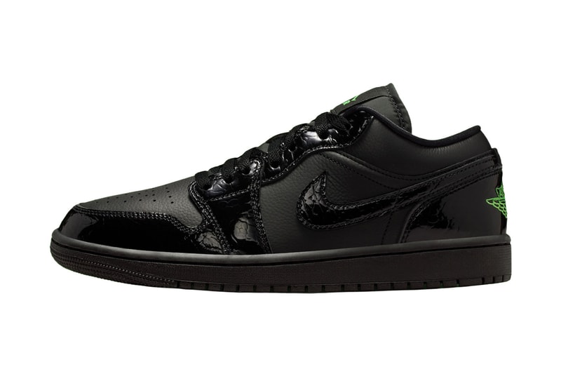 Official images reveal a predominantly black upper constructed from smooth leather, accented by glossy patent overlays that add depth and sheen to the design. The quarters and toe box maintain a matte finish, allowing the patent leather to stand out with subtle contrast. “Scream Green” detailing energizes the look, appearing on the embroidered Jumpman logo at the tongue, the insole branding, and the Wings logo stitched onto the heel. The laces remain black for a clean, understated balance, while the midsole continues the dark theme before transitioning into a green‑tinted outsole that ties the palette together.