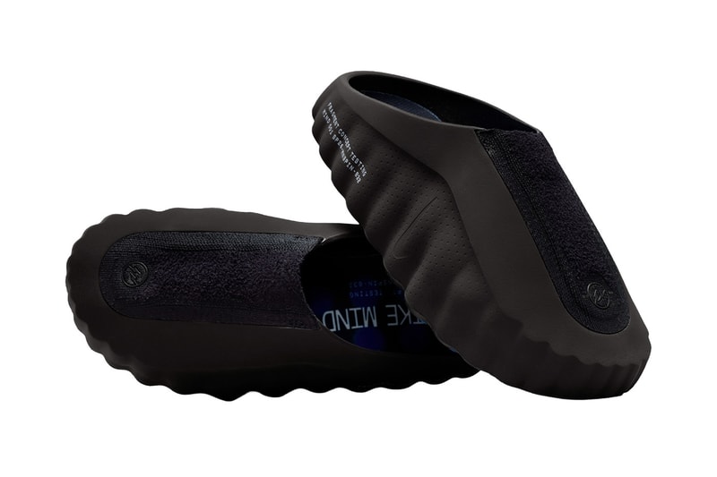 22 interfratedsensory nodes within the midsole that move against the foot, designed to stimulate areas of the brain while walking. This sits atop soft foam cushioning for comfort and responsiveness. Dressed in matte black with touches of royal blue, the Nike Mind 001 features an alternative Flyknit upper and a mule fit, complete with engineered perforations for breathability that give the shoe a lightweight profile.