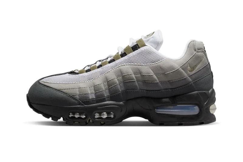 The design of the shoe is a rich tapestry of details. It features the signature greyscale gradient on the suede wavy upper panels, a hallmark of the Air Max 95. A deep olive green hue envelops the eyelets and embroidered Swoosh, complementing the black midsole and contrasting the mesh white upper, laces and tongue label. The return of the “Big Bubble” Air unit in the heel, a detail from the original 1995 prototypes, is a major highlight for purists.