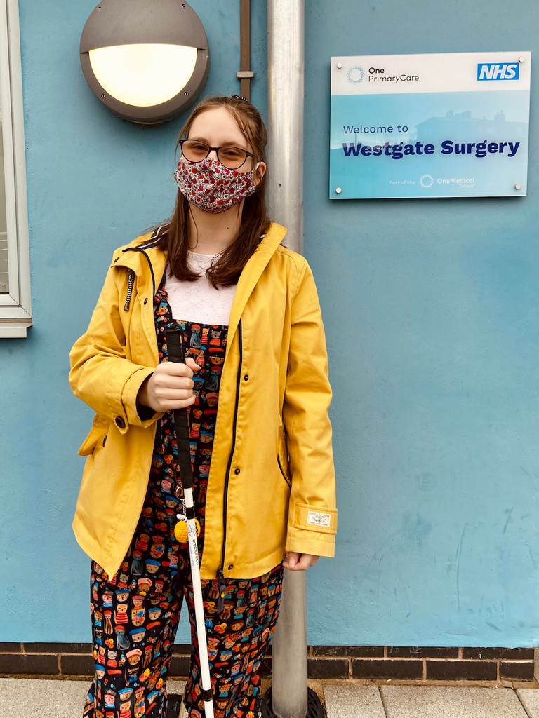 Chloe Tear, a disability blogger and content designer for a disability charity called Scope, also took her outfit into consideration before heading to get her first vaccine shot in Leeds, England. She wore a floral face mask, overalls covered with tiny (French!) cats, and a yellow raincoat. “I chose this outfit to make me feel empowered,” she tells Refinery29. Despite meeting the criteria for the vaccine due to her having Cerebral palsy, Tear wrote on Instagram that she was initially left off the list for England’s group-six qualification. She had to fight to get herself a shot — something that she recognizes is a problem, not only for her but for all people who have disabilities. “It’s not something we should have to fight for,” she says, “but these dungarees empowered me to keep fighting for my rights and to support others to do the same.”