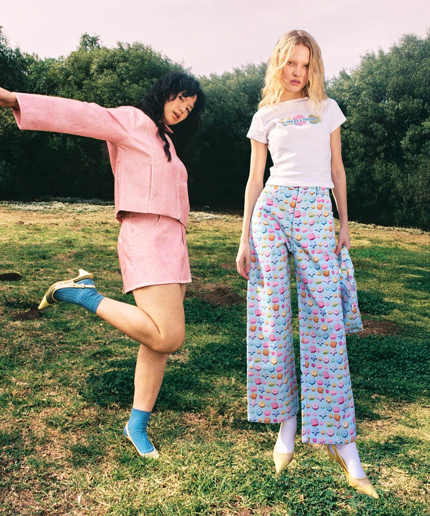 The playful-yet-wearable pieces include printed tote bags, checkered cardigans, quilted dresses, and matching jacket and skirt sets. There are also more youthful styles like candy-colored printed jeans, frill-trimmed shorts, and a heart-shaped bag. Get ready to unlock core memories through the graphic baby tees, with phrases like “cute as a button,” plus charm necklaces and keychains.