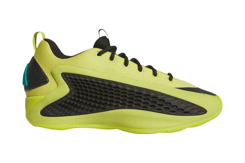 The sneaker commands attention with its neon lime green Primeblue knit upper, showcasing adidas’ commitment to sustainability. Black accents on the honeycomb-inspired cage, toe box and sockliner provide depth and definition, while teal branding on the faux carbon fiber heel counter adds a distinctive touch. Mismatched heel pull tabs introduce playful asymmetry, reflecting Edwards’ dynamic energy on the court.